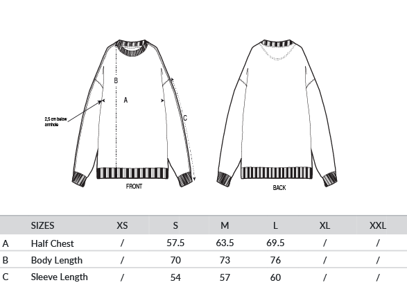 Set-in sleeves. Dropped shoulders. 1x1 ribs at collar, sleeve hems and bottom hem. Two-needle topstitches on all seams. Inside grosgrain back neck tape. Self-fabric half moon at back neck.